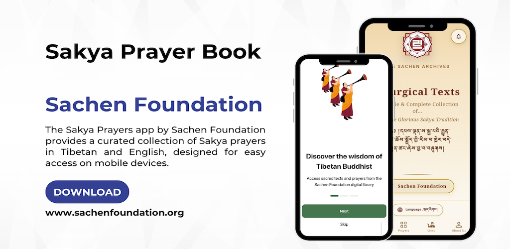 Sakya Buddhist prayer app with multilingual support for iOS and Android platforms.
